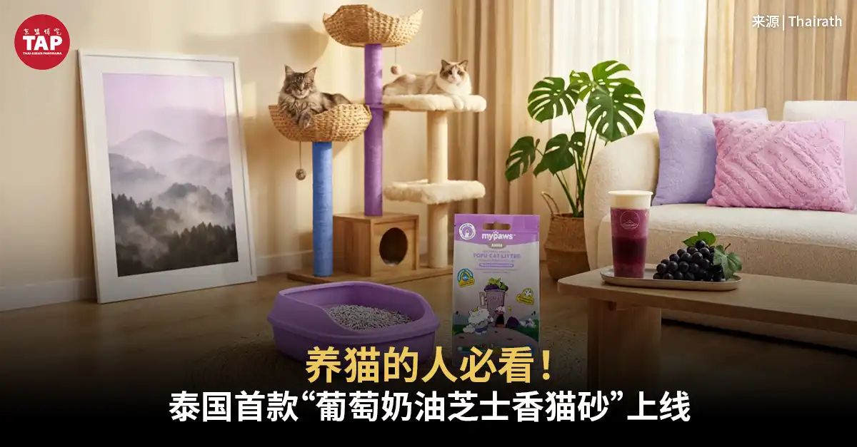 近日,泰国宠物护理行业迎来一项令人惊喜的跨界合作。主打“宠物是家庭重要成员”理念的宠物用品与生活方式品牌My Paws,携手本土茶饮品牌JIANCHA,打破行业边界,推出泰国首款“葡萄奶油芝士香型猫砂”,为市场带来全新体验。