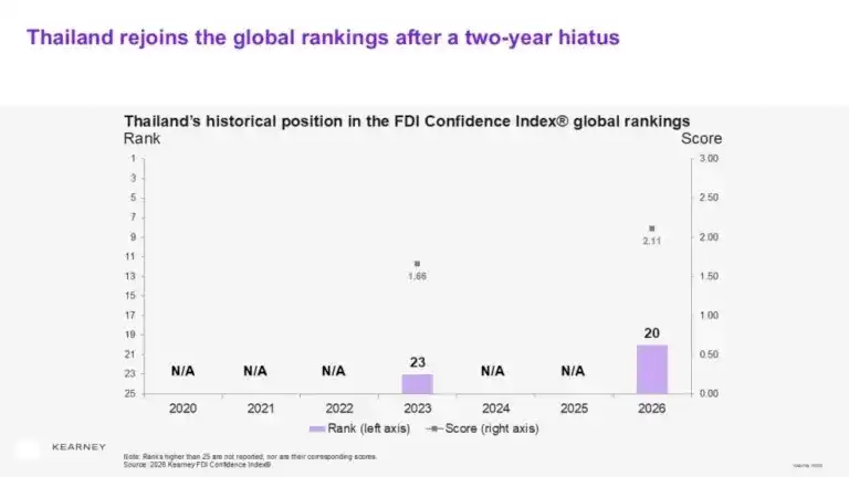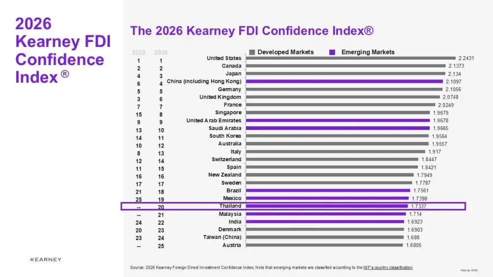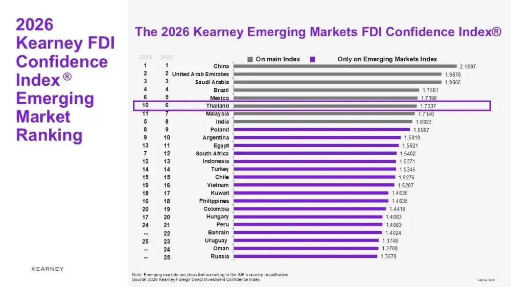 与此同时,2026年“外国直接投资信心指数”显示,泰国重返全球前25名,结束此前连续两年未上榜的局面,反映国际投资者关注度明显回升。这一变化主要得益于政府通过BOI加大对数据中心、电动汽车及清洁能源等未来产业的投资激励,并同步推进基础设施建设与投资便利化改革。